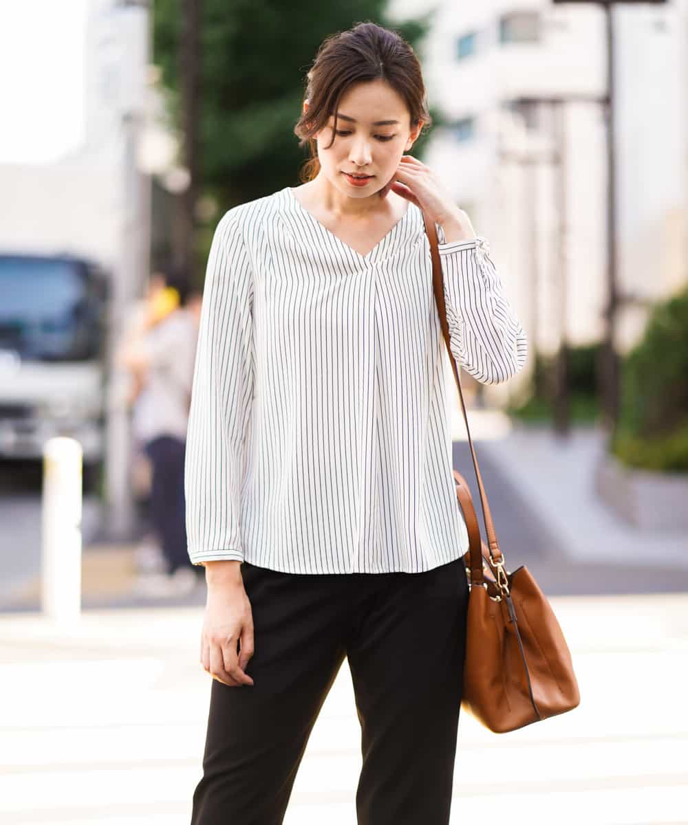 Vネックデザインで女性らしさを際立ててくれるブラウス。