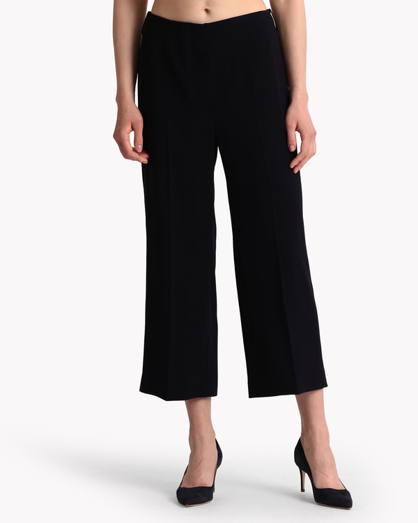 セミワイドシルエットのクロップドパンツ。ウエストまわりを美しく見せる股上のデザインで、トップスをインしてもクリーンに着こなせます。足首がやや覗く短めのレングスなので、フレッシュ&軽やかな印象に。コーディネートの幅が広がる万能スタイルです。ナチュラルなストレッチ性を兼ねた、アセテートとポリエステルの合撚糸を使用しました。バックサテンにすることで、ほど良いふくらみとドレープ性をプラス。弾力性や染色性に加え、吸湿速乾や帯電防止にも優れています。