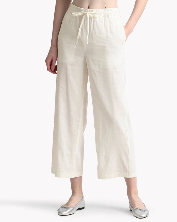 ウエストゴム&共紐使いが新鮮なワイドクロップドパンツ。足元が覗くレングスで軽やかな印象です。脚のラインを拾わない絶妙なシルエットで、美脚効果も◎。オーガニックリネンにヴィスコースを混紡した新素材で仕立てました。ドライなタッチとシャリ感のある風合いが特長のファブリックです。