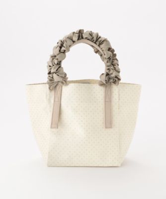 クシュクシュッとしたハンドルが可愛らしい<ラドロー>のバッグです。人気のグレープハンドルシリーズは、見た目がお洒落なだけでなくしっかりと手に馴染んで持ちやすいのも魅力。光沢のあるドット柄を落とし込んで華やかなルックスに仕上げました。コンパクトなサイズながら、マチ幅がたっぷりとあるので見た目以上の収納力を発揮してくれます。