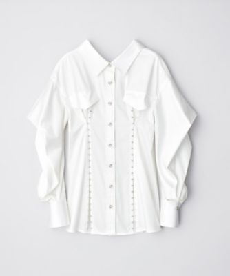 着物の抜き衿の様な衿ぐりと、折り紙のようにジオメトリックで構築的なボリュームのある袖がモードな印象のシャツ。ホックのとめ方でシルエットの変化を楽しめます。