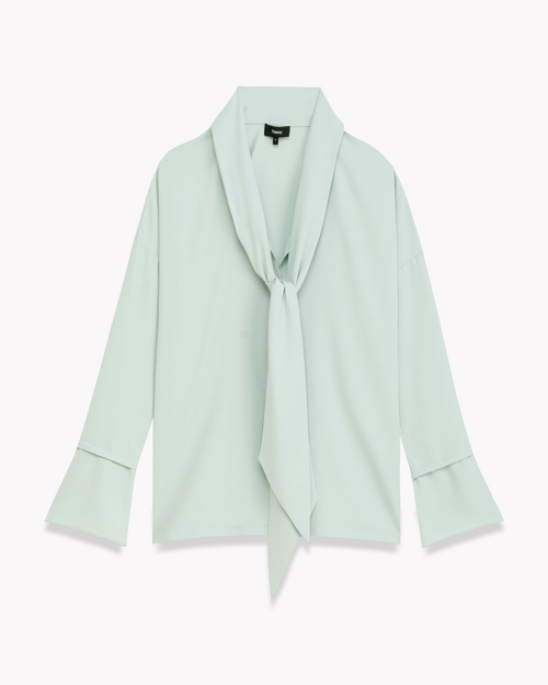 スカーフのようなタイディティールが印象的なブラウス。デコルテを綺麗に見せてくれるVネックと動くたびに揺れるスリット入りカフスが女性らしさを演出。ドレープが美しく、ぬめり感のある素材はシルクのような高級感のある仕上がりです。ご家庭で手洗いでき、季節を問わず着られるドライな風合いで機能的にも優れています。